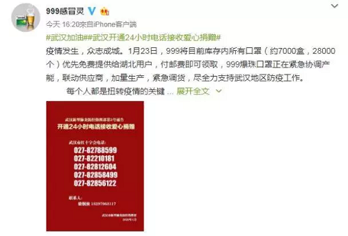 华润集团三九医药紧急联系供应商, 以备充足的药品和口罩,大幅度增加板蓝根、抗病毒药品的储备,实行全员紧急装卸,第一时间送到所需场所。